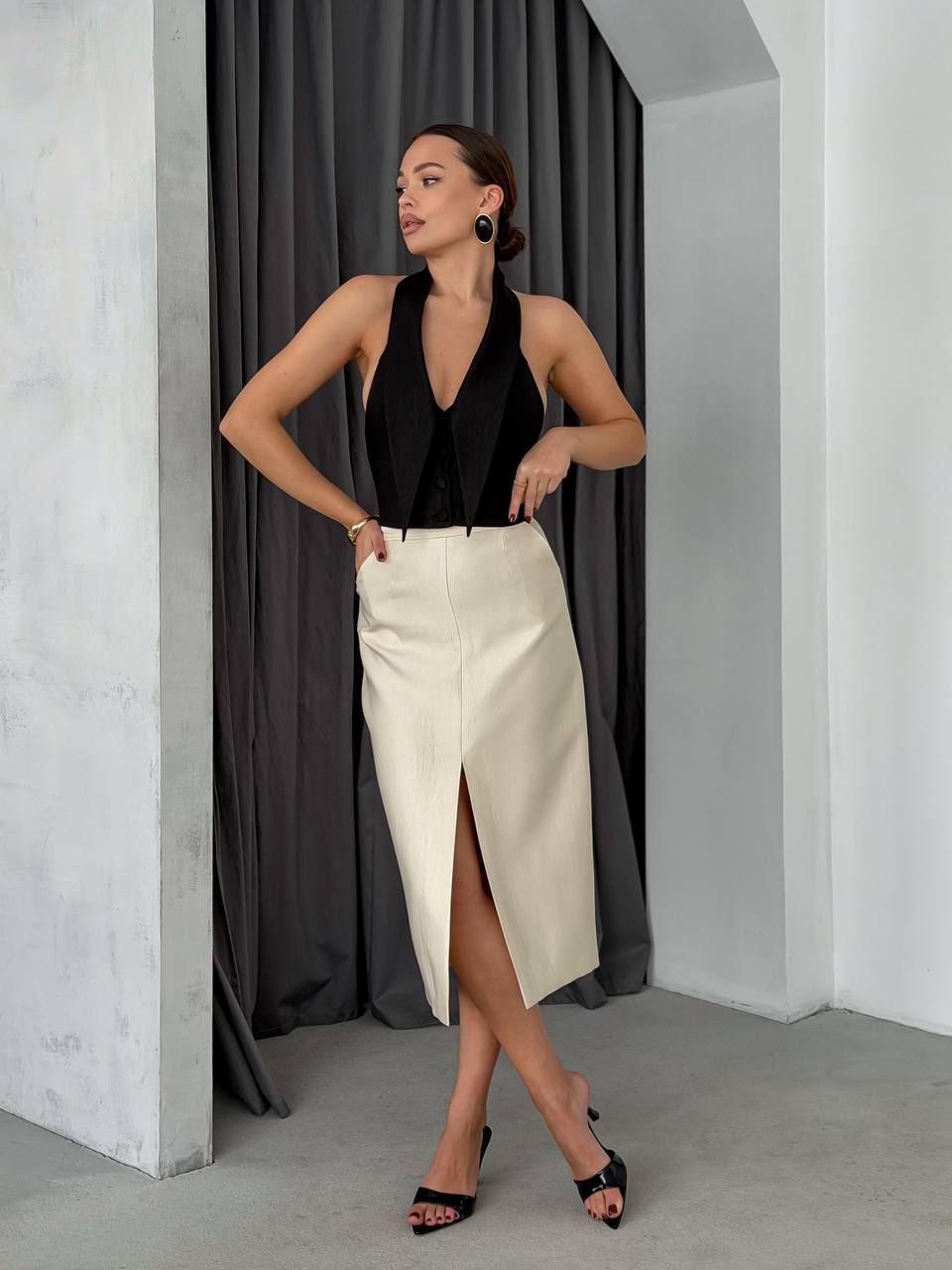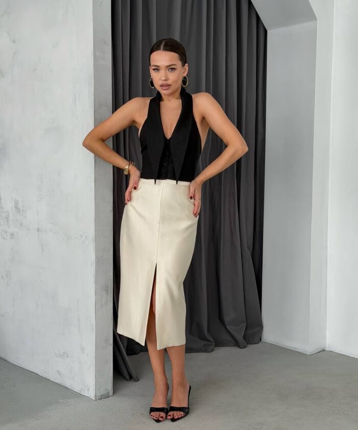 Юбка BLANC миди с разрезом спереди подчёркивает движение и добавляет лёгкую интригу образу.